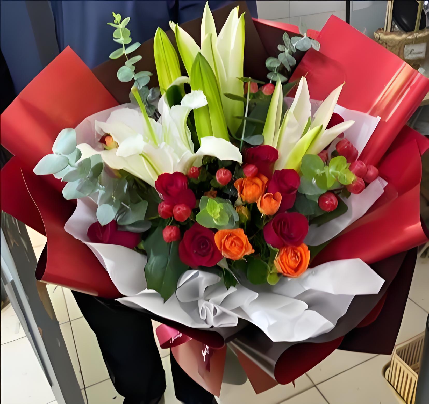 呼伦贝尔花店包11枝红玫瑰、2枝多头白百合、6枝橙色多头玫瑰、红豆、尤加利叶
